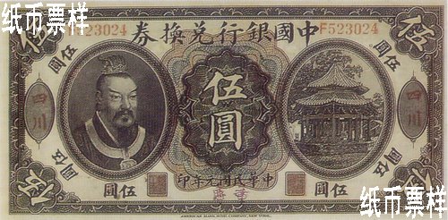中國(guó)銀行于1912年續(xù)李鴻章像兌換券發(fā)行后,還發(fā)行了由美國(guó)鈔票公司印制的黃帝像壹圓、伍圓、拾圓三種兌換券,由各地陸續(xù)發(fā)行。