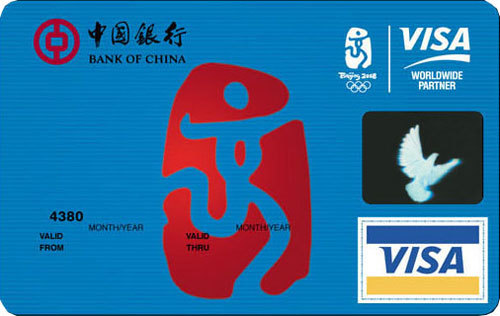 | 卡面介紹:卡面不分金銀,以奧運五環(huán)顏色“紅、黃、藍(lán)、綠、黑”為獨立卡基色分別推出五種卡片??嬷醒胗∮?008北京奧運會會標(biāo),左上角印有中國銀行標(biāo)志,右側(cè)為VISA標(biāo)志。 |