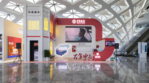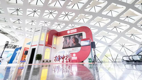 到達(dá)登錄廳,首先可以來“百年中行品牌形象展區(qū)”逛逛。在延續(xù)首屆消博會(huì)吸睛無數(shù)的復(fù)古騎樓造型基礎(chǔ)上,進(jìn)一步加入高科技元素,體現(xiàn)百年來傳統(tǒng)與現(xiàn)代的交融,中行紅的絲綢連接古今,從海上絲綢之路到海南自貿(mào)港建設(shè),中行一直都在。