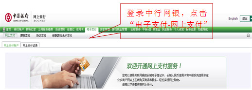 1、登錄中行網(wǎng)銀,點(diǎn)擊“電子支付-網(wǎng)上支付”選項(xiàng)。