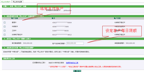 3、在您的網(wǎng)上銀行關(guān)聯(lián)賬戶中選定網(wǎng)銀支付賬戶,您可在銀行最大限額下設(shè)定客戶每日限額(您網(wǎng)上支付的交易限額還與商戶支持的卡類型及限額有關(guān),具體請(qǐng)參見商戶公告或頁面提示)。