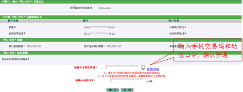 4、輸入手機(jī)交易碼和動(dòng)態(tài)口令完成網(wǎng)上支付服務(wù)的開通。如您持有二代USBKey,可將USBKey插入電腦完成交易簽名與服務(wù)開通。