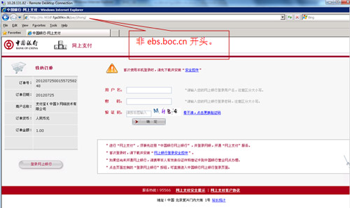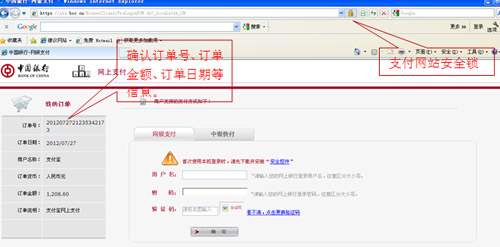 2、請(qǐng)仔細(xì)核對(duì)訂單號(hào)、訂單日期、訂單金額等關(guān)鍵信息,查驗(yàn)登錄頁瀏覽器地址欄后是否有“安全鎖”標(biāo)志。核對(duì)無誤后再登錄中國(guó)銀行網(wǎng)上銀行進(jìn)行支付。