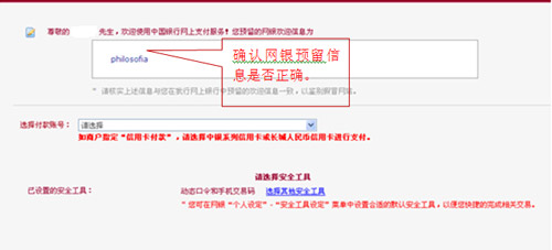 3、登錄中國(guó)銀行網(wǎng)上銀行,請(qǐng)首先確認(rèn)“預(yù)留信息”是否正確,再選擇付款賬號(hào)進(jìn)行支付。