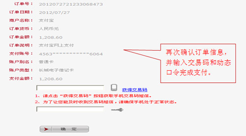 4、請(qǐng)?jiān)俅魏藢?duì)訂單信息,核對(duì)無誤后再輸入手機(jī)交易碼和動(dòng)態(tài)口令完成交易。如您持有二代USBKey,可將USBKey插入電腦完成交易簽名。
