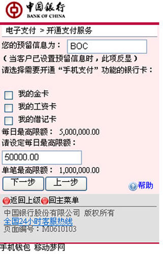 設(shè)置用于手機(jī)支付的銀行卡(必選)、支付限額(必填),設(shè)置完成后點(diǎn)擊“下一步”(圖8)。