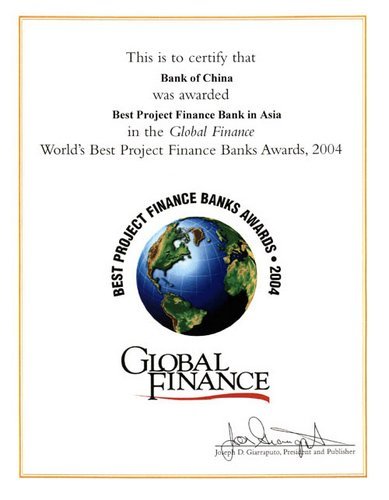 In the October 2004 issue of the Global Finance, Bank of China was named as the "Best Project Finance Bank – Asia".