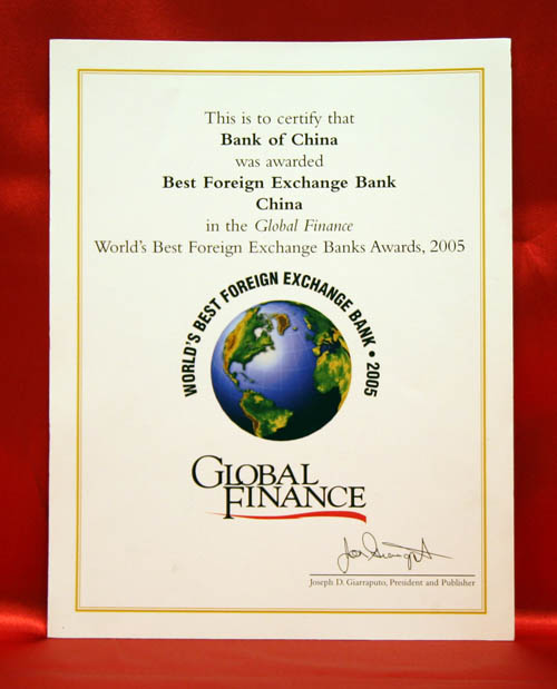 In the January 2005 issue of the Global Finance, Bank of China was named as the "Best Foreign Exchange Bank – China".