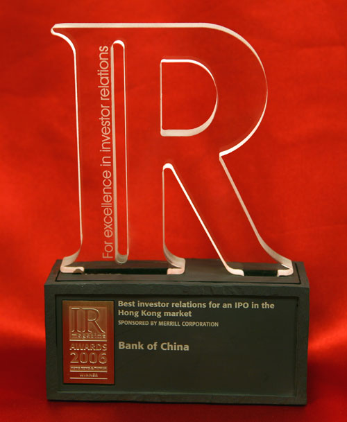 In the December 2006 issue of the Investor Relations, Bank of China was named as the "Best investor relations for an IPO in the Hong Kong market".