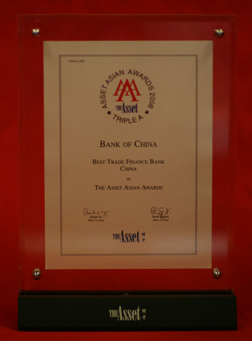 In the February 2008 issue of the Asset, the magazine published its Triple A Transaction Banking Awards 2008. Bank of China was named as the "Best Trade Finance Bank - China".