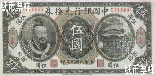 The portrait of Emperor Huang Di printed on the left of the front side and the picture of octagonal pavilion with double-hipped roof on the right; the landscape of bridge and trees printed on the back |