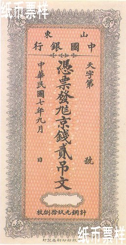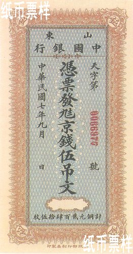 In 1918, Shandong Province witnessed the circulation of copper cash notes in one thousand stringed cash, two thousand stringed cash and five thousand stringed cash, as well as the lengthwise copper coin note with the denomination of 100 copper coins, which were printed by the Bureau of the Engraving and Printing of Ministry of Finance.