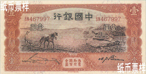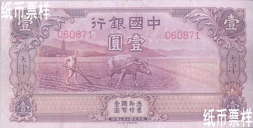 Bank of China issued a five-yuan national currency note of Tianjin in 1931, a ten-yuan one in 1934 and a one-yuan one in 1935, which were printed by Thomas De la Rue & Co., Ltd. The national currency notes of Tianjin with the domination of one yuan were issued in 1935, which were printed by Thomas De la Rue & Co., Ltd. A one-yuan national currency note with a farmer and cattle pattern printed by Thomas De la Rue & Co., Ltd. in 1934 was not issued for certain reason.