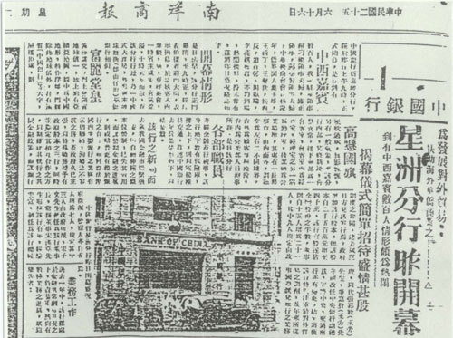 A report on Nanyang Siang Pau on June 16, 1936 about the opening of Bank of China Singapore Branch