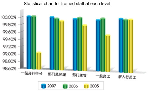 Bank of China has attached much attention to staff training. Targeted training has been carried out for executives, technical personnel and operators in the international financial research institutes in Beijing and Shanghai, as well as at the training centers at home and in New York, London, Singapore and Hong Kong, with the annual training coverage exceeding 98%.