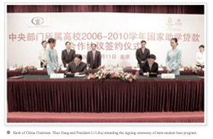 Bank of China has positively implemented the state policy of promoting education on an equal footing. In 2004, Bank of China became the exclusively authorized entity to offer State-subsidized student loan for 115 universities designated by the government. By the end of 2007, Bank of China had issued loans totalling RMB 7.826 billion to 795,700 needy students from these universities, with a loan balance of RMB 6.901 billion.
