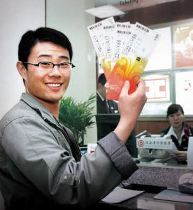 Picture on the right: Beijing citizens receiving their Olympic tickets at Bank of China's outlet