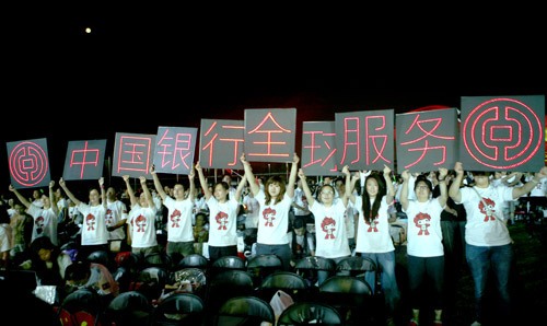 As the sole banking partner of the Beijing Olympic Games, Bank of China provided financial service for the Games and successfully completed all assigned service tasks, realizing the goal of "no complaint and no error". The staff of Bank of China who served the Olympic Games also presented at the concert to commemorate the first anniversary of the Beijing Olympic Games and wish China a better future.