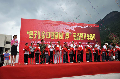 The new primary school, located in Jinzishan Township, Qingchuan County of Sichuan Province, is named Jinzishan Bank of China Loving Care Primary School. By a unique "loving care deposit" activity, Bank of China has attracted more than a hundred depositors in Zhejiang to donate their interest of mature deposits since last year. With a total raised fund of RMB 10 million, Bank of China Zhejiang Branch and the Hangzhou Charity Federation jointly built the modern primary school in the mountainous area of Sichuan, over 2,000 kilometers away from Hangzhou, providing a new study environment for hundreds of pupils who lost their school due to the earthquake.
